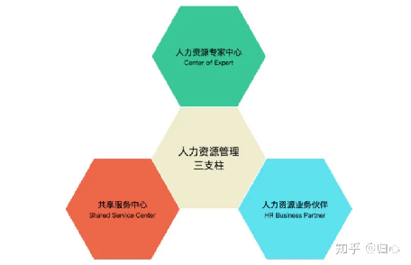 隨著企業越來越重視員工的體驗,這種按照職能分類的方式就逐漸被“三支柱”模型代替了(三支柱模型中其實還有“四角色”,本文中就不贅述了)。“三支柱”模型是對人力資源部進行了橫向切分。面向員工的叫“共享服務中心”(SSC),員工可以一站式咨詢辦理所有業務,跟部門對接、為業務經理負責的是“業務伙伴”(HRBP),而負責企業人力資源戰略和流程制度輸出的是“專家中心”(COE)。